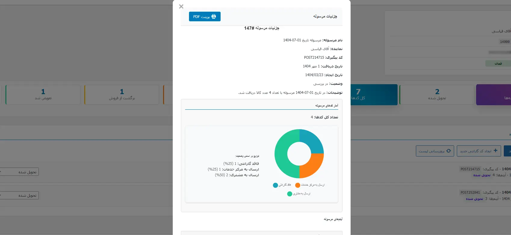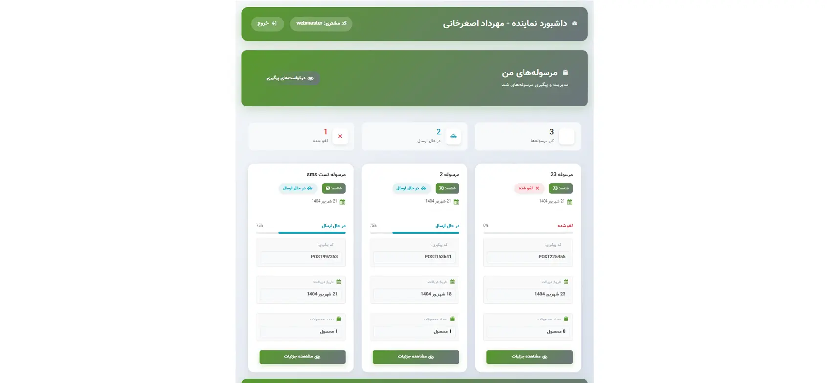 ایجاد و مدیریت ارسالها، اقلام و وضعیتها، خروجی CSV و جزئیات هر ارسال.